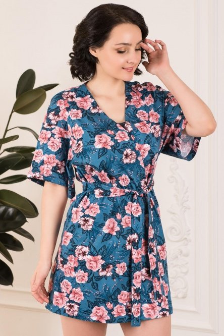 Халат в оттенке петроль, украшенный цветочным принтом.Модель на запах свободного и простого кроя с поясом в комплекте, который подчеркивает линию талии.Рукав халата средней длины.